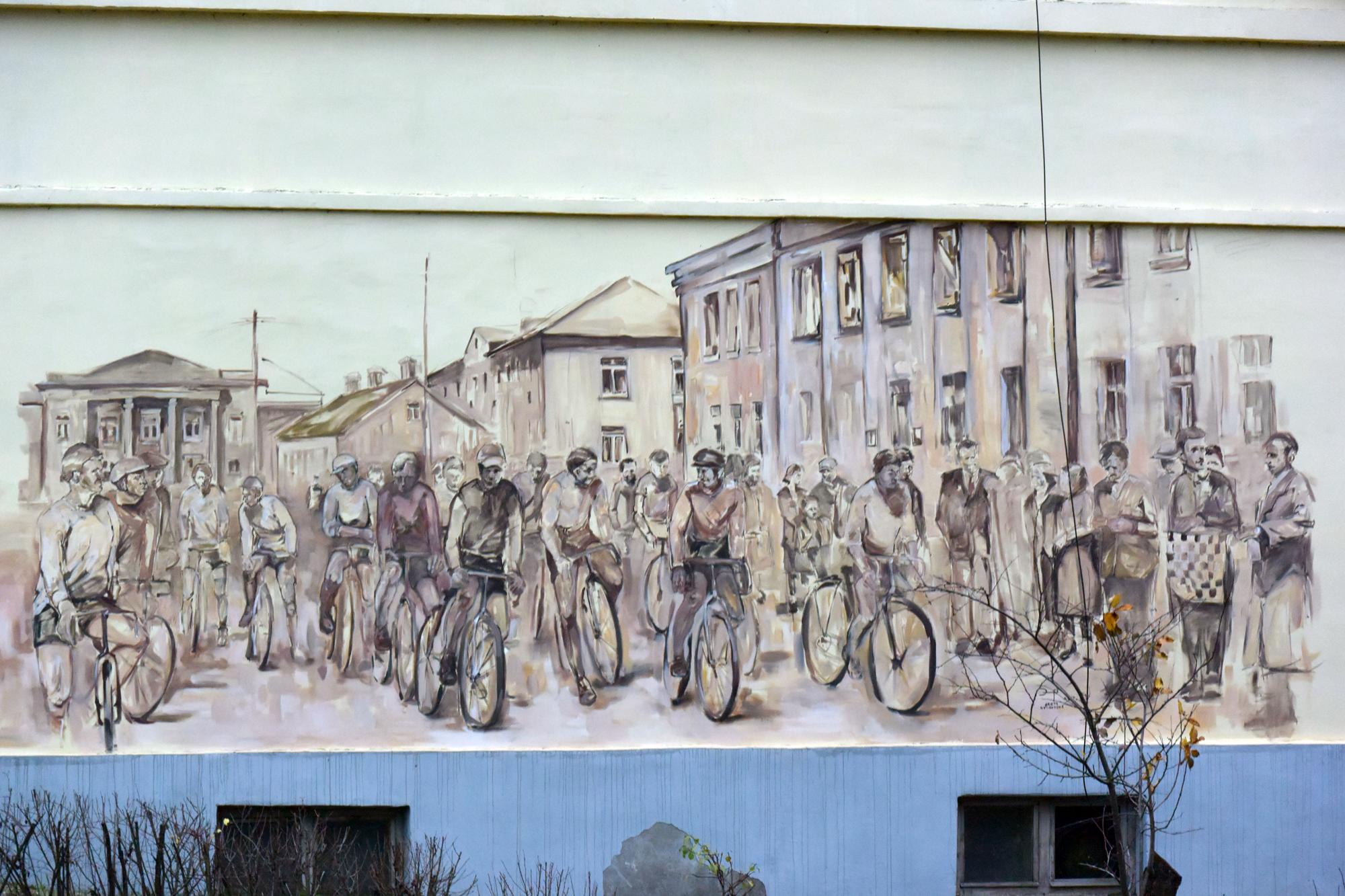 В краевой столице Карсаве изобразили городскую сценку с велосипедистами.