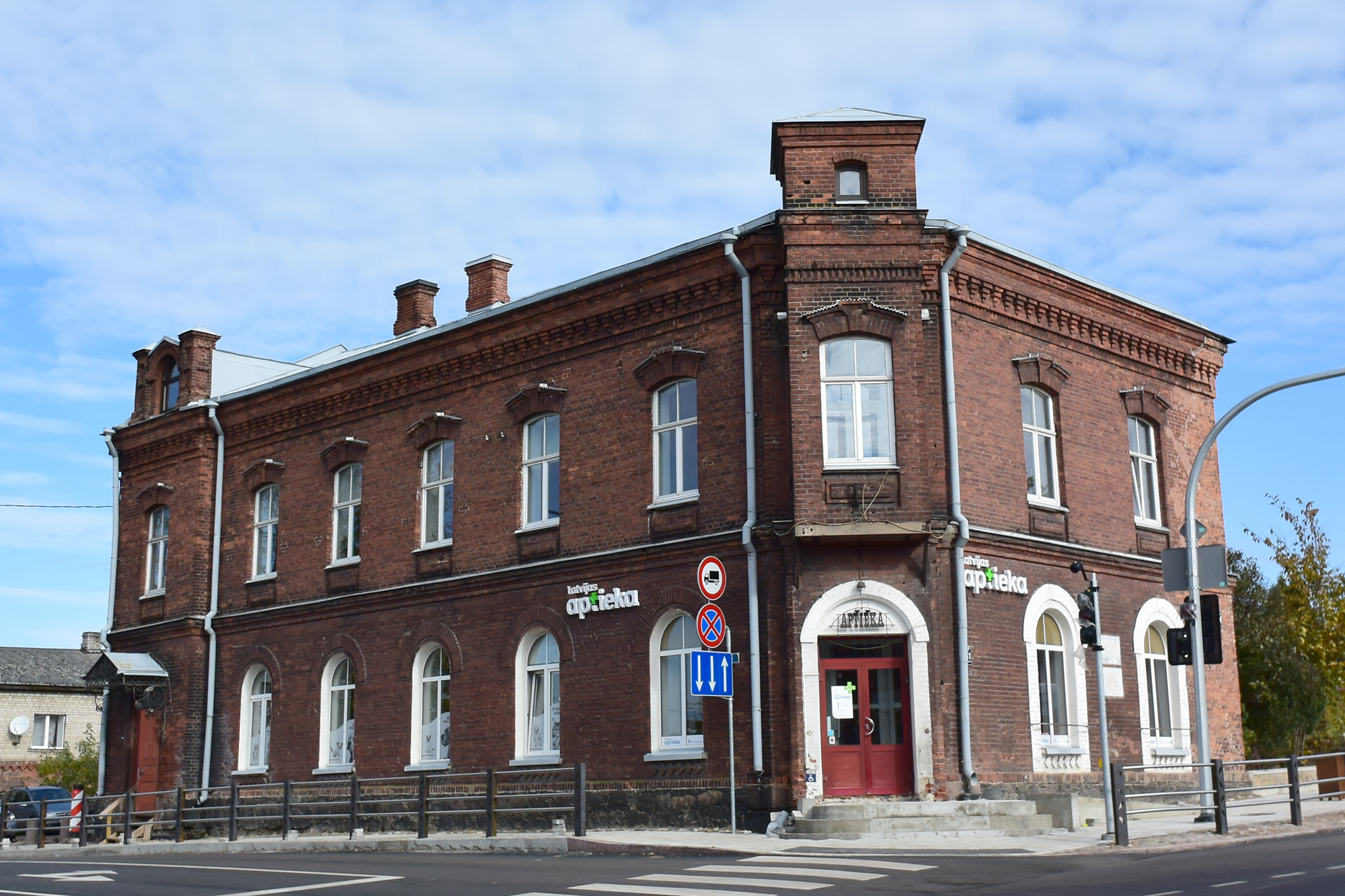 Дом визуально выделяется, поскольку все остальные краснокирпичные фасады на Латгалес смотрят непосредственно на улицу, а здание аптеки – угловое. Над главным входом (тоже угловым) видны остатки декоративной башенки, уничтоженной при бомбардировке Резекне. С 1894 по 1933 годы аптека принадлежала профессиональному провизору Хуго Гринбергу, среди многих названий его было и "Аптека Гринберга". На доме установлена мемориальная доска известного в Латвии политика, первого латгальского министра, Владислава Рубулиса. Он был профессиональным фармацевтом и недолго проработал в резекненской аптеке.