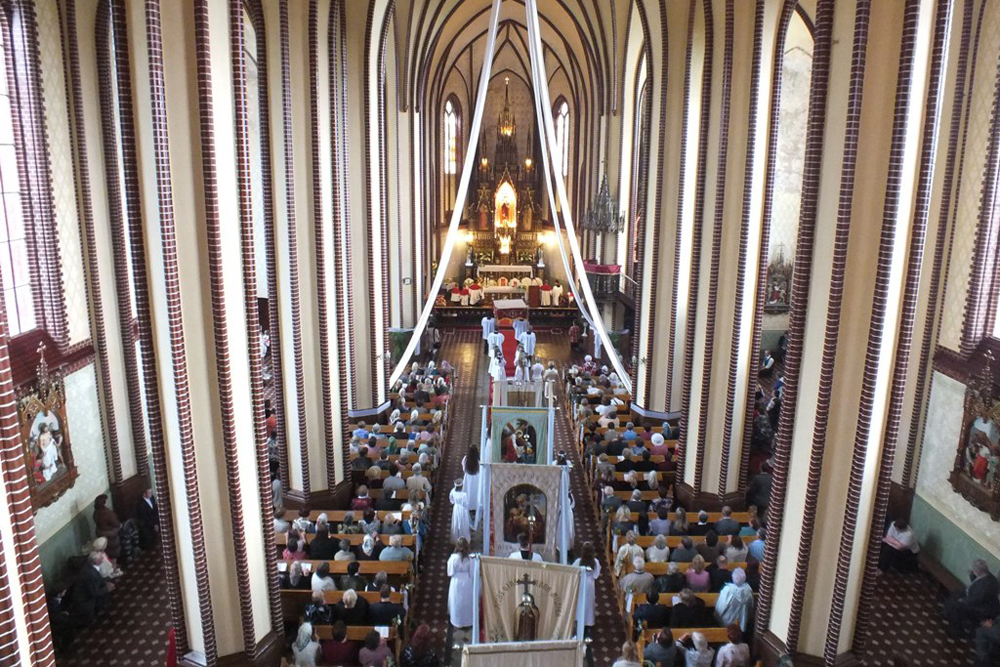 Нынешний храм - краснокирпичное здание в неоготическом стиле с двумя башнями имеет 30 метров в длину и 17 в ширину. На звоннице три колокола – самый большой весом в 609 кг. В интерьере храма три дубовых алтаря в готическом стиле. На большом алтаре – фигура Иисуса с изображениями Святых. На правой стороне – алтарь Святого Иосифа с изображением Святого Антония сверху, а слева – алтарь Св. Франциска Ассизского. У внушительного церковного органа очень красивое звучание. В храме есть весь необходимый литургический инвентарь.