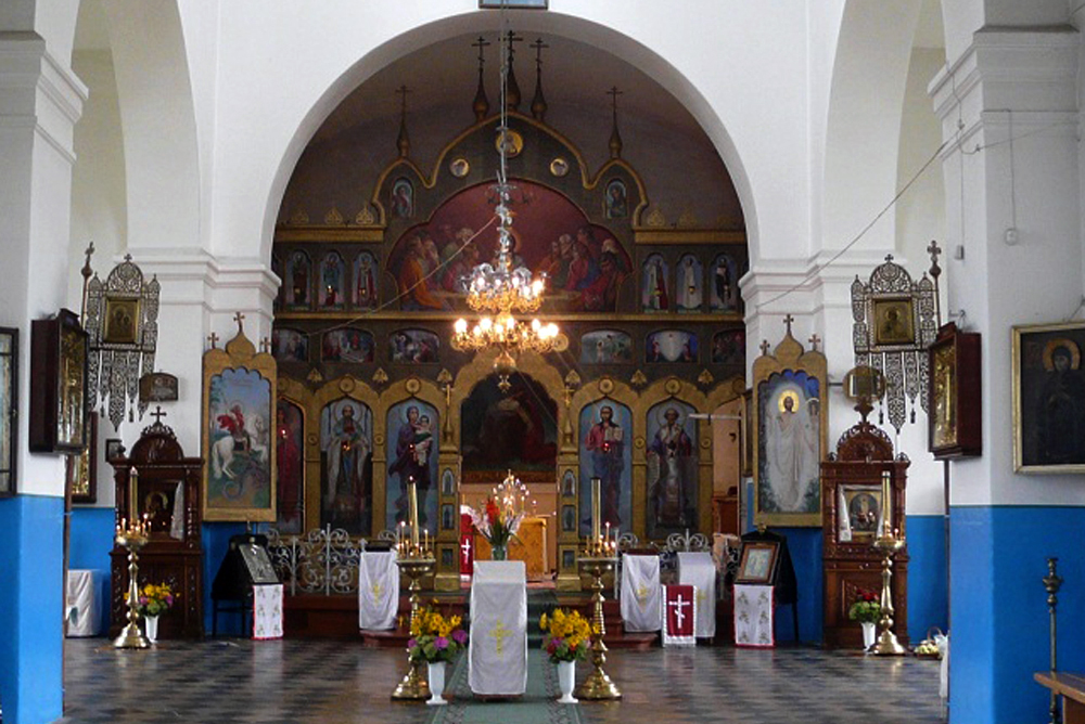 Храм в основании построен в форме креста (29 х 17,5 х 13,3 м) и был увенчан шестью куполами. Пол в храме покрыт разноцветными плитами. Все иконы иконостаса написаны академиком живописи Н. И. Верхотуровым. В 1907 г. художник не только руководил работами по созданию иконостаса, но и сам написал для него десятки икон.