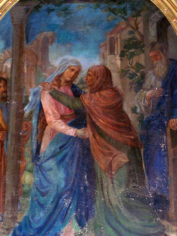 Но главное место в храме занимает алтарная картина "Встреча Марии и Елизаветы". В католической традиции "Посещению Марии" (Visitatio Mariae) посвящен отдельный праздник, который празднуют 31 мая, между Благовещением и рождением Иоанна. Встреча Девы Марии и её двоюродной сестры Праведной Елизаветы - матери Иоанна Крестителя, описана в Евангелии от Луки (Лк. 1:39-56). Елизавета стала первым человеком, провозгласившим Богоматери её великое будущее. Слова её "благословенна Ты между женами, и благословен плод чрева Твоего" вошли в состав христианской молитвы, называемой в православии Песнь Пресвятой Богородицы, а в католицизме Радуйся, Мария ("Аве Мария").
