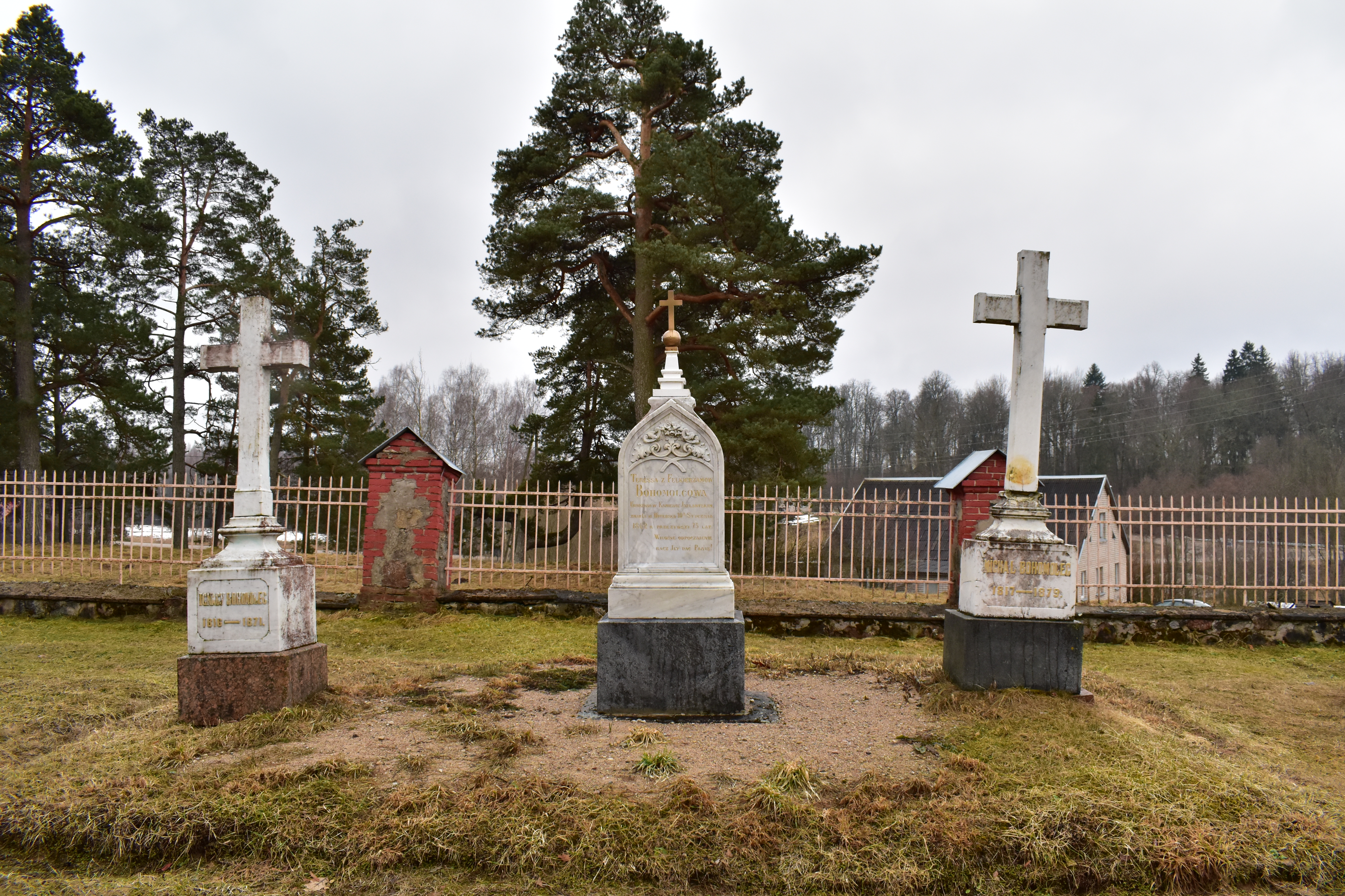 Храм, освященный в честь Воздвижения Св. Креста (Sv. Krusta pagodināšanas katoļu baznīca) был построен, как часовня-усыпальница по указанию дворянина из знатного рода Фёлкерзамов. И находилась эта часовня сначала в паре километров от своего нынешнего места расположения, в селении Соломенка. Усыпальницу позднее разобрали и перевезли в Розентову. В 1842 году тесную церковку удлинили, на средства тогдашнего владельца Розентовы – поляка Богомолеца. Три самых внушительных креста справа от храма – могилы Игнасия Богомолеца (1816-1871), Терезы Фёлькерзам-Богомольцевой (сразу две значимые для церкви фамилии) и Михаила Богомолеца (1817-1879).