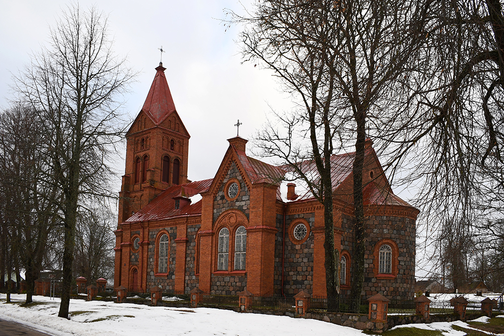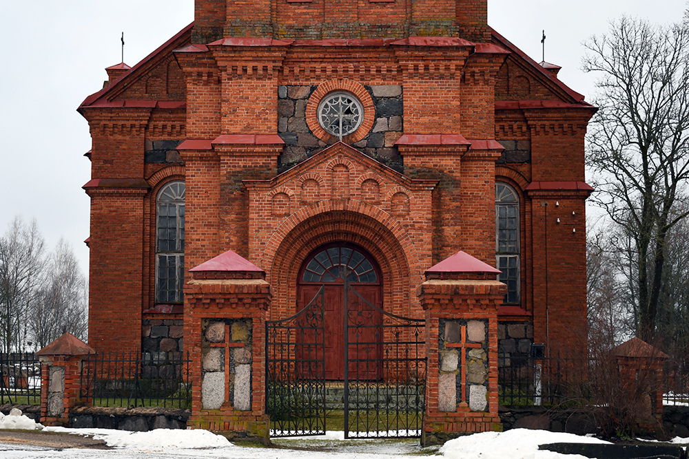 Краснокирпичный храм, возвышающийся в небольшом латгальском селе, как и большинство латгальских валунно-кирпичных храмов построен в начале XX века. Как водится, на месте старинного деревянного костёла.