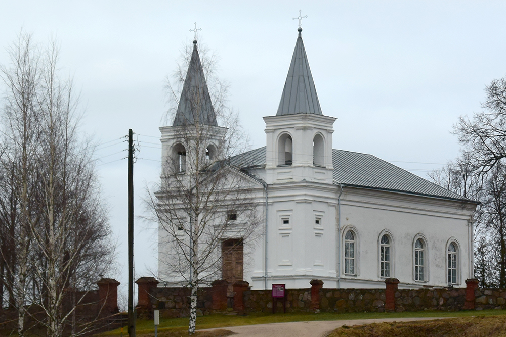 Краснокирпичный храм, возвышающийся в небольшом латгальском селе, как и большинство латгальских валунно-кирпичных храмов построен в начале XX века. Как водится, на месте старинного деревянного костёла.